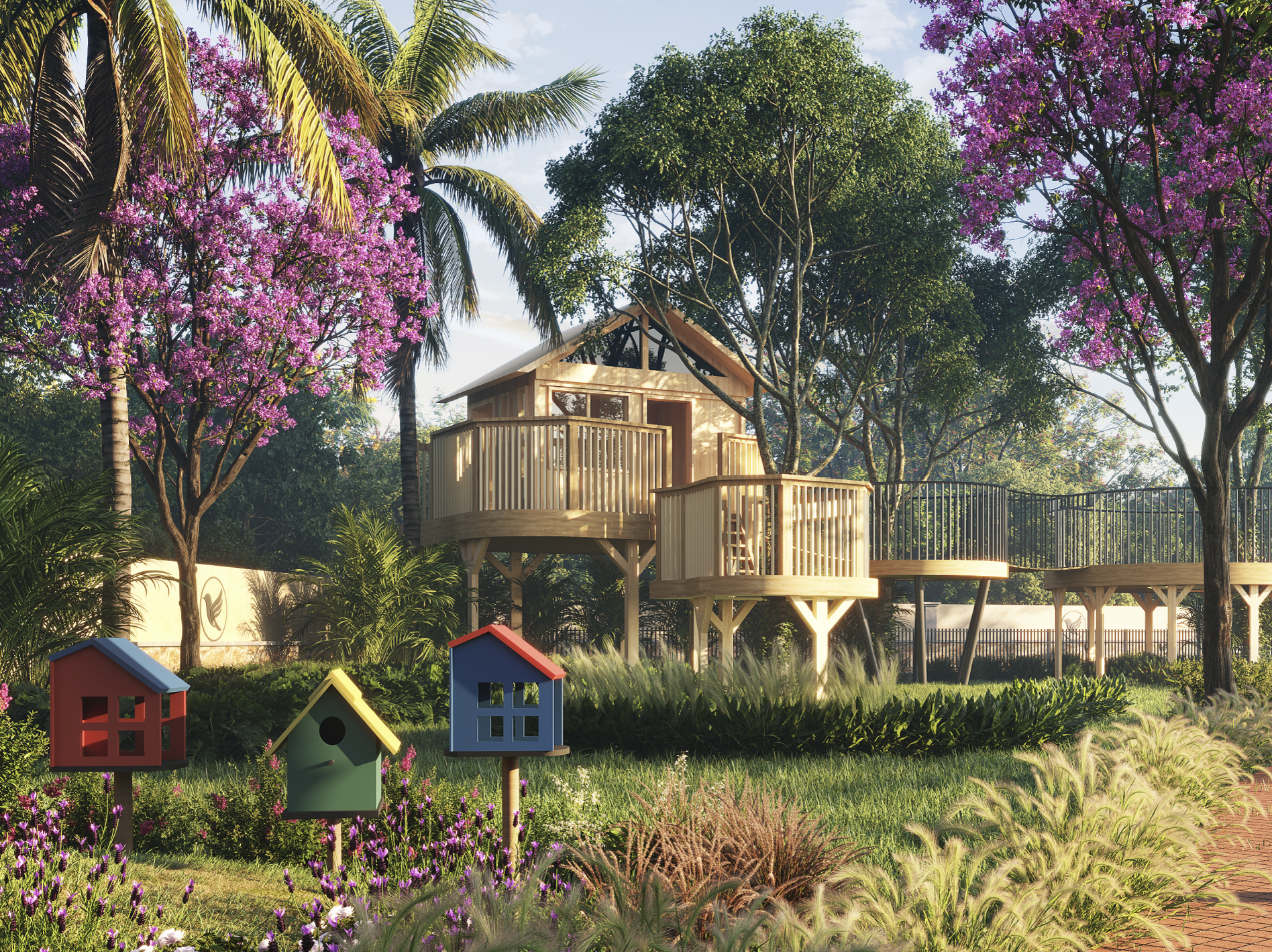 The tree house is designed as a unique escape inspired by nature and childhood imagination, offering a calm and elevated space where residents can relax, read, and reconnect with the outdoors while enjoying a sense of freedom and tranquility above the landscape.